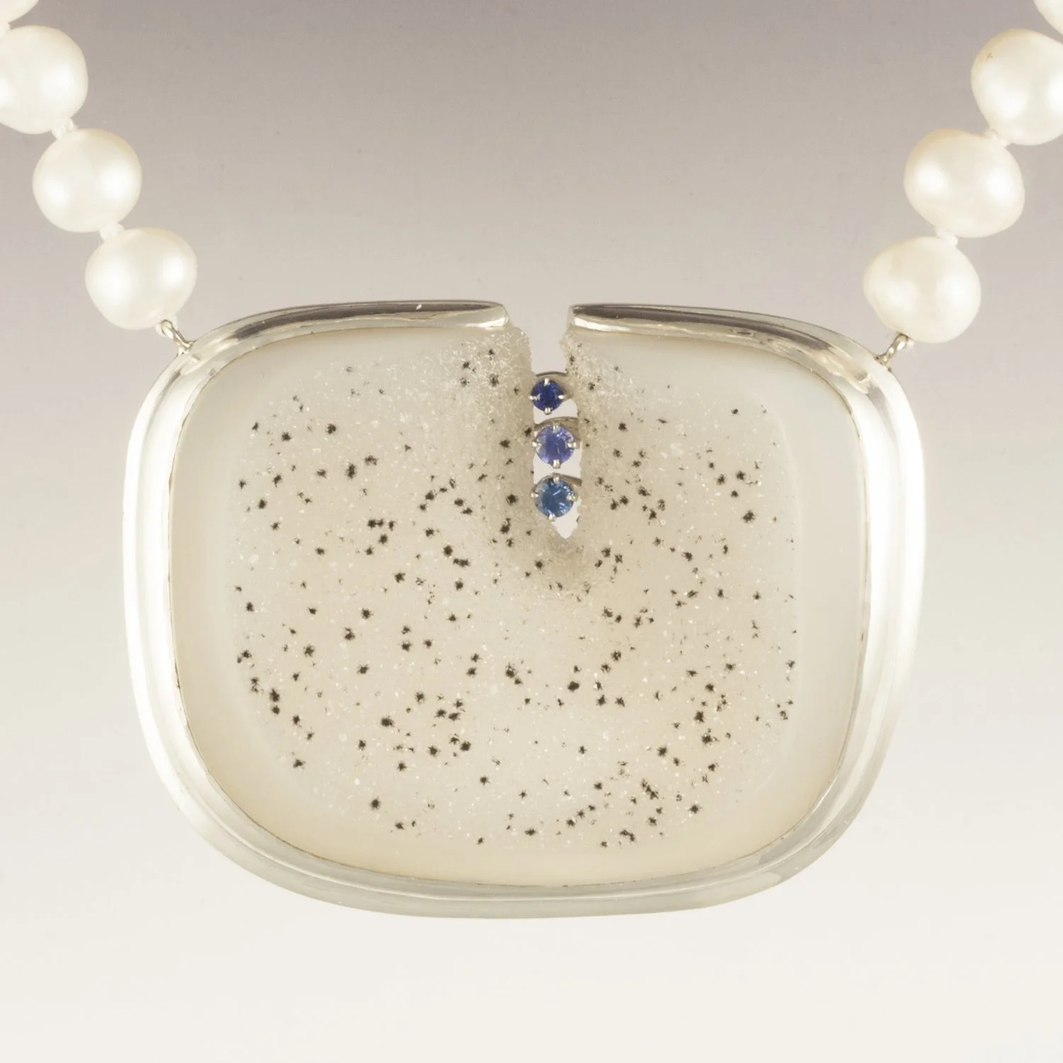 White Drusy Agate Necklacesterling silver & platinum with sapphire and pearl stone carved by Dieter Lorenz