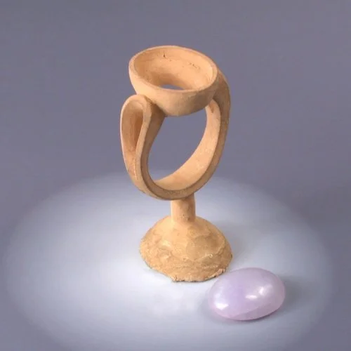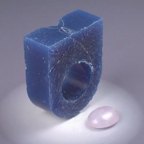 In the lost wax casting process, Paul carves a model of the jewelry piece out of blue wax, in this case a ring. This photo shows the ring blank and the customer's stone around which the ring will be designed.